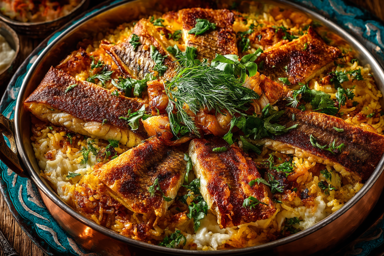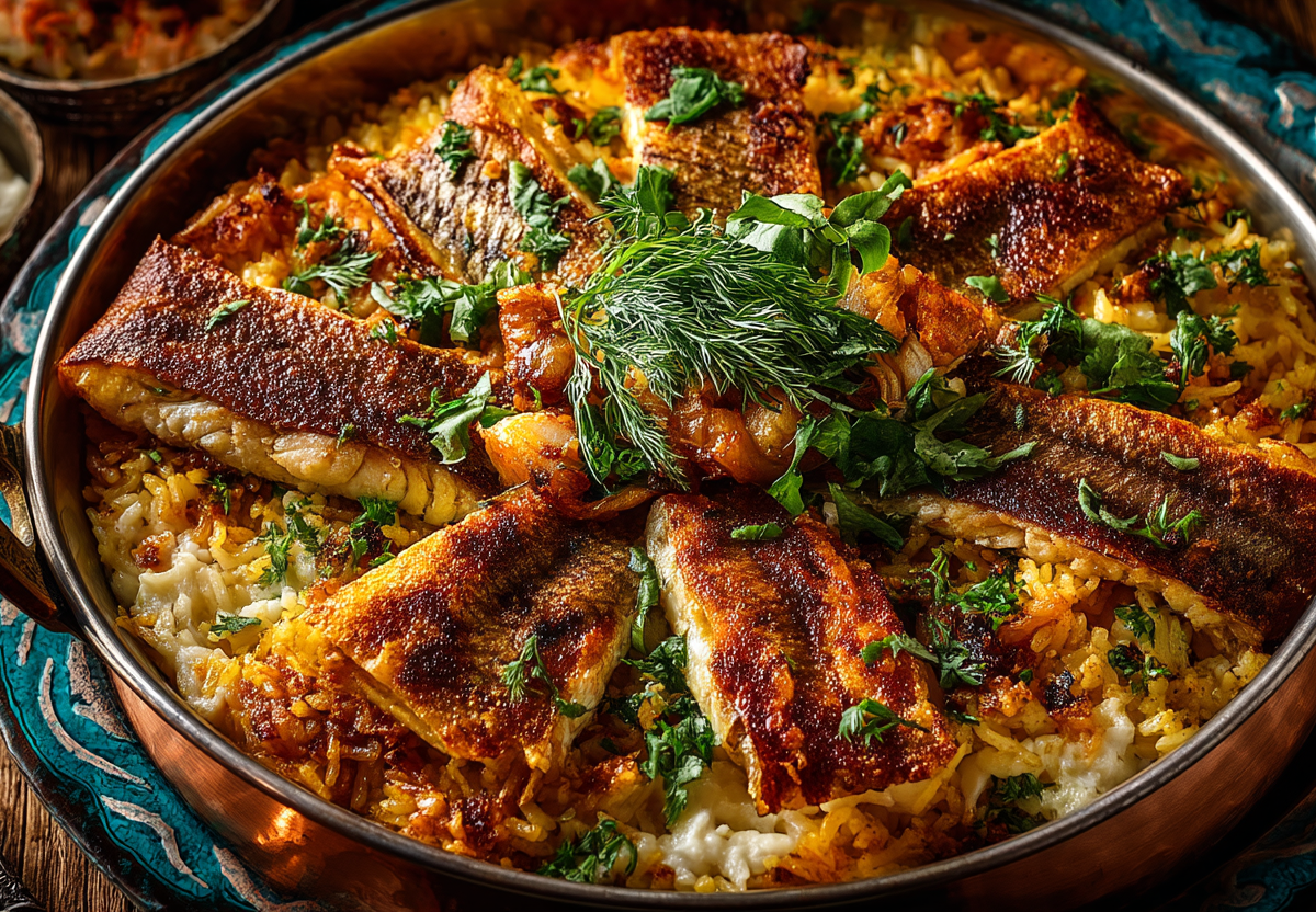 Истинный вкус этому плову дарит не только рыба, но и особый прием — казмаг. Подстилка из лаваша или теста на дне казана не просто защищает от пригорания. Она медленно пропитывается соками, превращаясь в хрустящий, невероятно ароматный деликатес, который подают вместе с пловом, создавая потрясающий контраст текстур.
