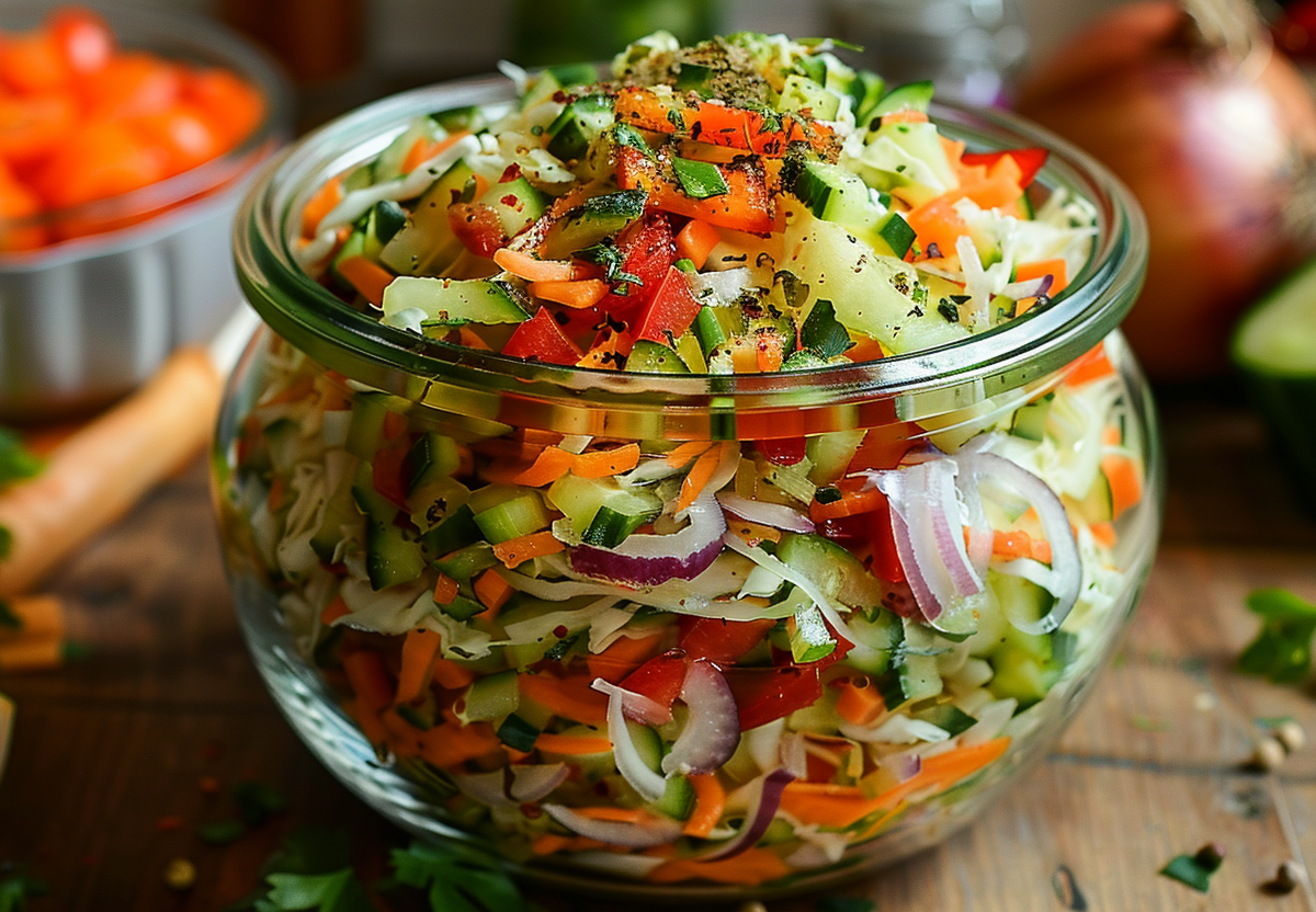 Шаг 3. Смешайте все овощи в большой миске, добавьте молотый тмин и кориандр. Залейте остывшим маринадом, аккуратно перемешайте. Накройте и оставьте при комнатной температуре на 6–8 часов, периодически помешивая.