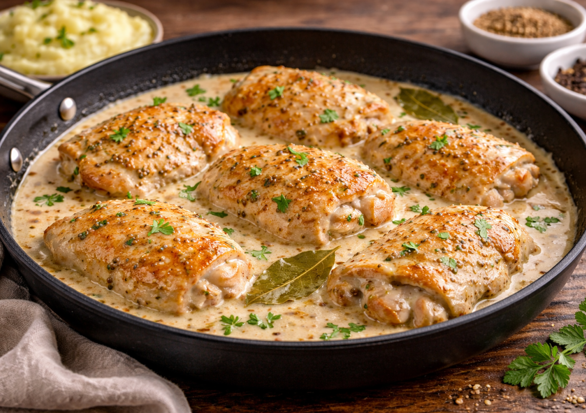Нежная курица в сливочно-горчичном соусе получается ароматной, сочной и очень насыщенной по вкусу. Простые ингредиенты превращаются в настоящее домашнее блюдо, которое отлично подойдет и для ужина, и для гостей. Готовится легко, всегда удается и не требует сложных продуктов.