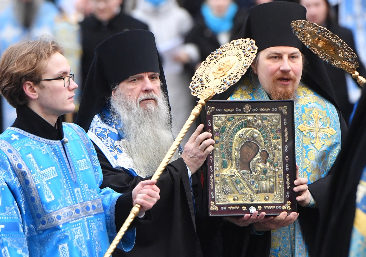 Священнослужители несут икону Казанской Божией Матери в Успенском соборе Московского Кремля