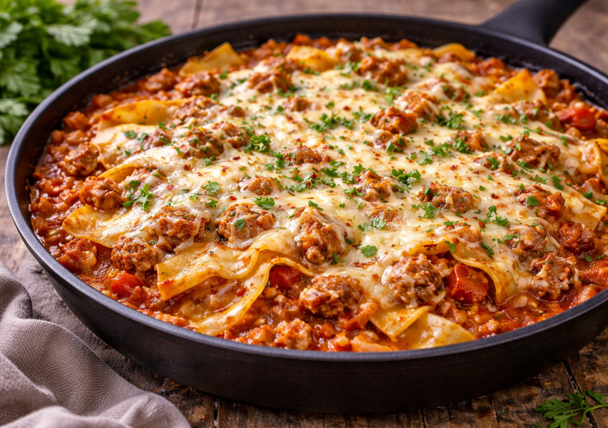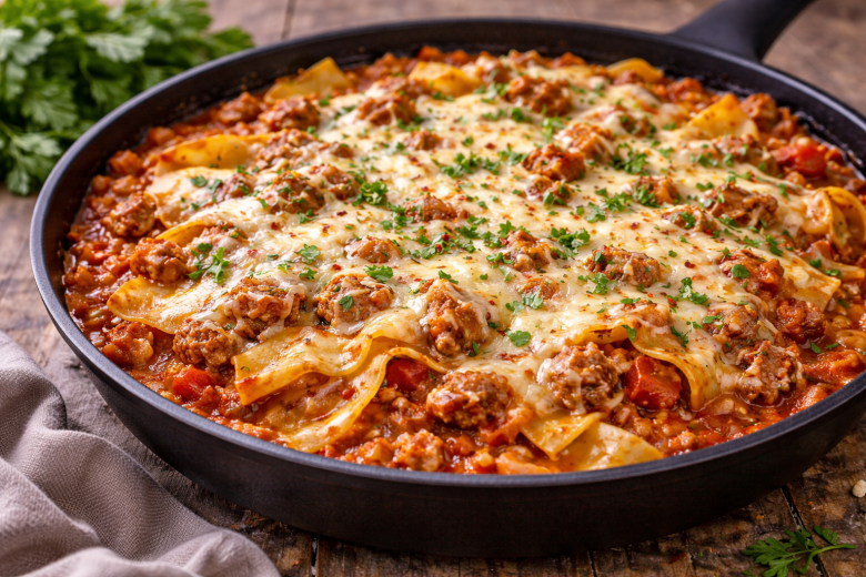 Этот вариант ленивой лазаньи выручает, когда хочется сытного и вкусного блюда без долгой возни. Все готовится в одной сковороде: сочный фарш, ароматный томатный соус, листы лазаньи и тянущийся сыр. По вкусу — как классическая лазанья, а по времени — в разы быстрее.
