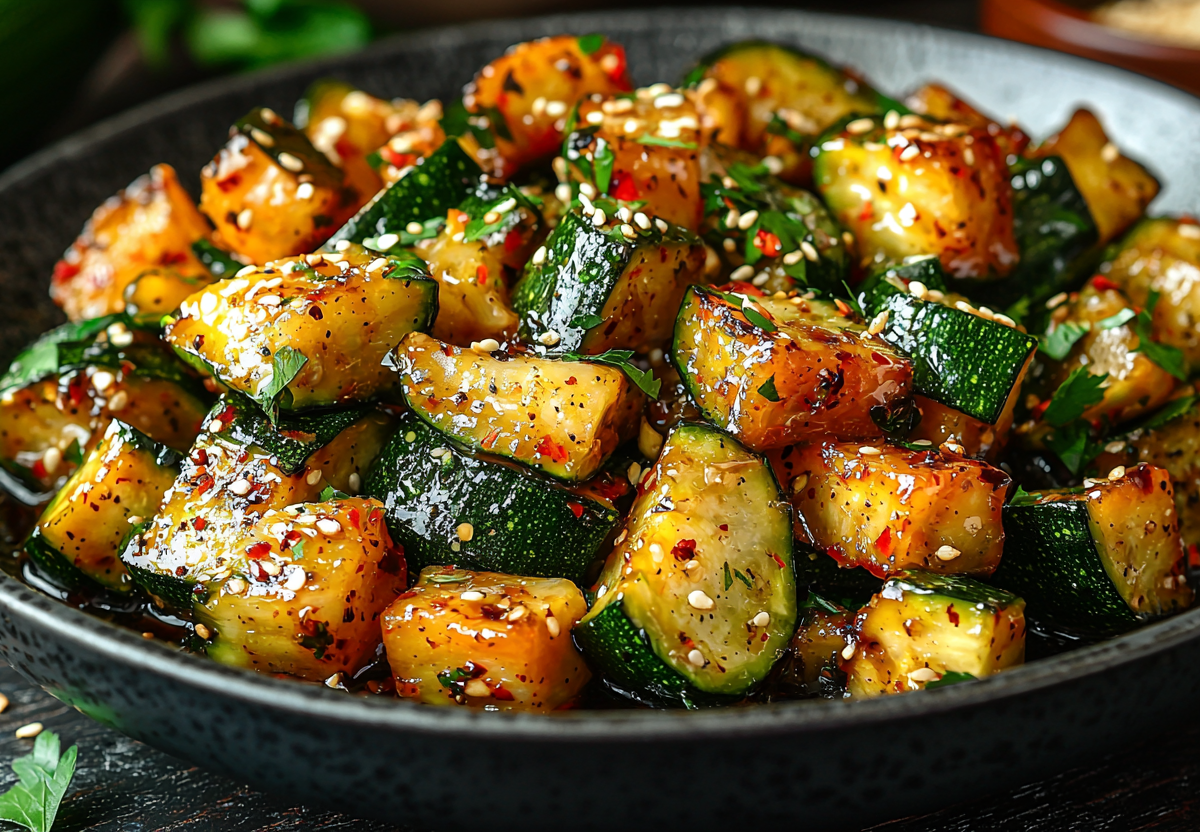 Это блюдо — настоящая находка для тех, кто хочет разнообразить привычное меню. Нежные кусочки кабачка в насыщенном солено-сладком соусе с яркими нотками чеснока и имбиря готовятся всего за несколько минут. Идеальная легкая закуска или гарнир, который точно удивит ваших близких азиатскими акцентами.