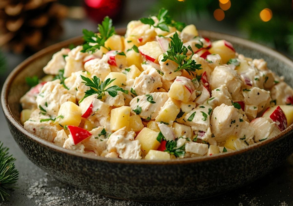 Традиционно на новогодний стол подают салат оливье. Если классическая версия надоела, предлагаем добавить в нее нотку свежести. Готовим салат оливье с курицей и яблоками!