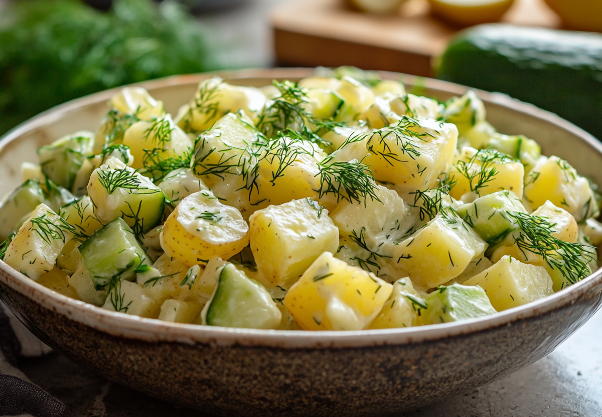 Для приготовления понадобятся: 4 средние отварные картофелины, 3 свежих огурца среднего размера, пучок зеленого лука, пучок свежего укропа, 4–5 столовых ложек сметаны, соль по вкусу. Картофель и огурцы нарежьте кубиками среднего размера. Зеленый лук и укроп мелко порубите. В просторной салатнице соедините картофель, огурцы и зелень. Добавьте сметану и соль по вкусу. Тщательно перемешайте все ингредиенты, стараясь не превратить картофель в пюре. Дайте салату настояться 10–15 минут в холодильнике, чтобы вкусы объединились. Подавайте охлажденным как самостоятельное легкое блюдо или как гарнир к мясу или рыбе.