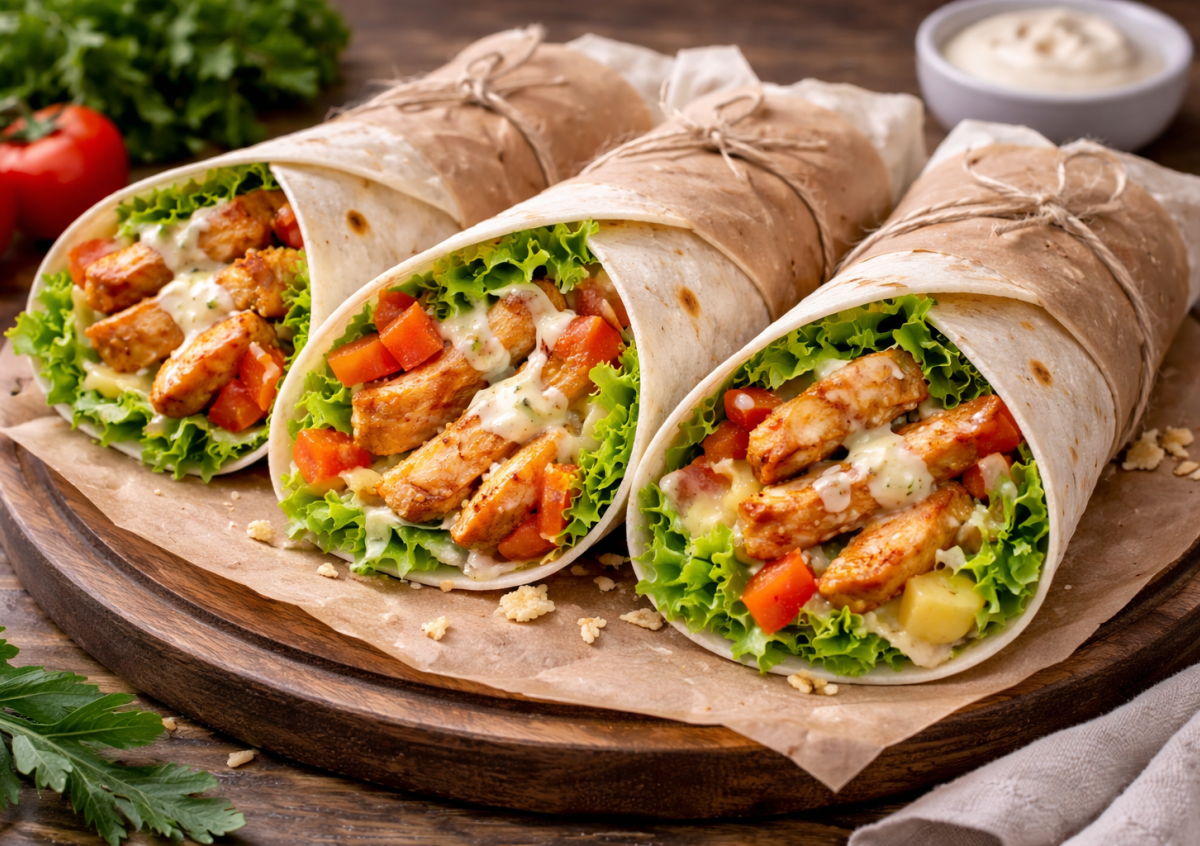 Ингредиенты: куриная грудка — 1 кг, тортильи (пресные лепёшки) — по количеству, соль — по вкусу, чёрный молотый перец — ½ ч. л., паприка — ½ ч. л., молотый кориандр — ½ ч. л., сушёный чеснок — ½ ч. л., томатная паста — 1 ст. л., листовой салат — по вкусу, помидоры — по вкусу, твёрдый или плавленый сыр — по вкусу, майонез или сметана — 2 ст. л., чеснок — 1 зубчик.