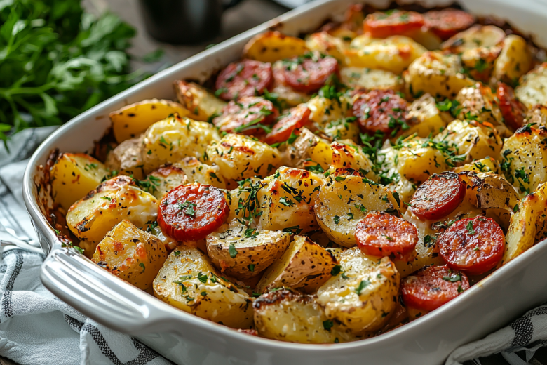 При запекании все компоненты томятся в собственном соку: картошка становится мягкой и пропитывается ароматом сосисок и томатов, сосиски подрумяниваются, а помидоры отдают свою сочность, создавая легкий соус.