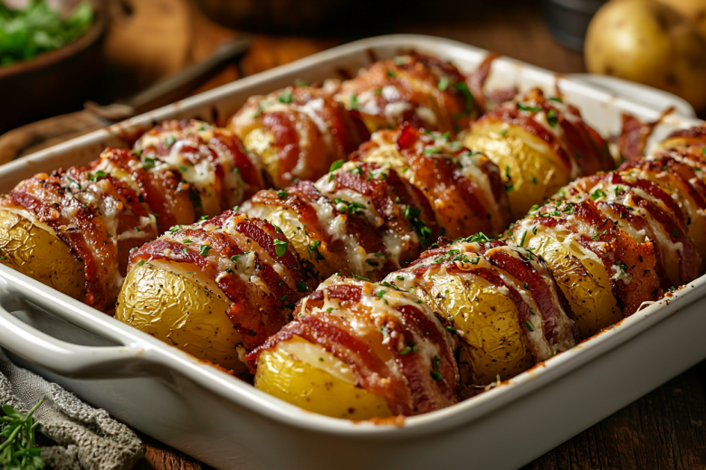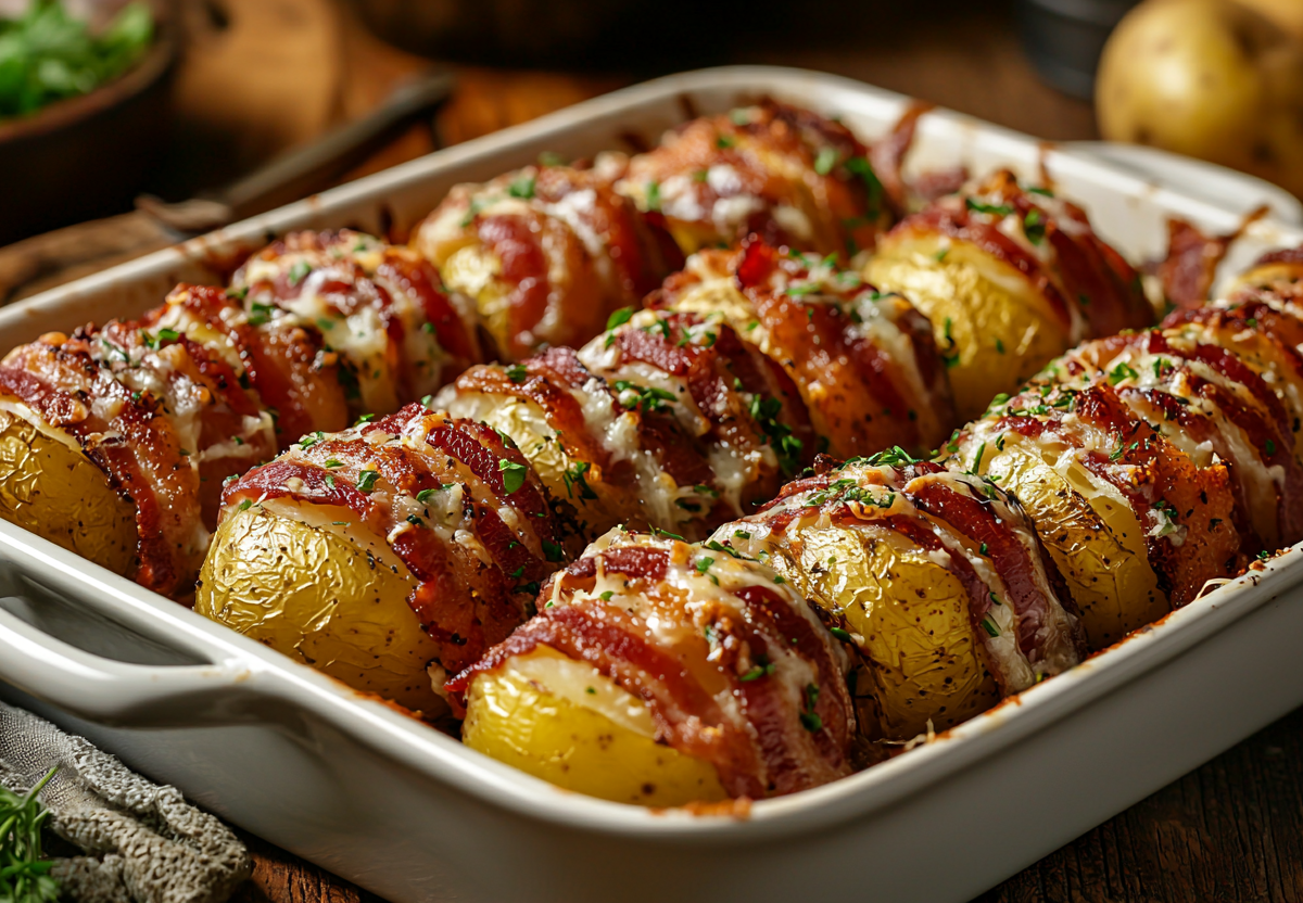 Для приготовления понадобится: 12 небольших картофелин, 12 ломтиков бекона, 200 г сметаны (15–20%), 3–4 зубчика чеснока, соль, черный перец, паприка, сушеный укроп или петрушка. Картофель отварите в подсоленной воде. Остудите. Каждую картофелину плотно оберните ломтиком бекона. Выложите завернутые клубни в форму для запекания, смазанную маслом. В миске смешайте сметану, пропущенный через пресс чеснок, соль, перец и все специи до однородности. Полейте этой смесью картошку в беконе, стараясь, чтобы соус попал между клубнями. Разогрейте духовку до 200°C. Запекайте 25–35 минут, пока бекон не станет хрустящим и золотистым, соус должен слегка загустеть. Подавайте горячими прямо из формы, посыпав свежей зеленью.