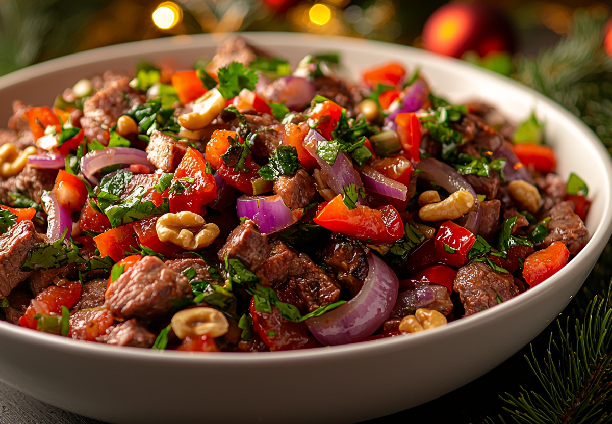 Когда надоело все майонезное и тяжелое: грузинский салат «Тбилиси» — яркий акцент праздничного стола. Пикантный, сытный и очень ароматный салат, в котором нежная отварная говядина сочетается с хрустящими овощами, орехами и знаменитыми грузинскими специями. Идеальный выбор для тех, кто ищет альтернативу традиционным майонезным салатам.