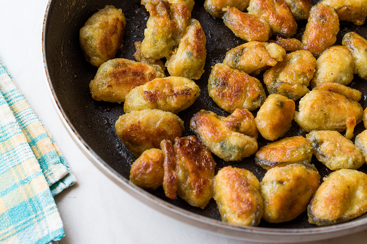 - Каждую мидию обмакните в кляр и аккуратно опустите в масло. Не бросайте — масло может брызнуть. Обжаривайте до золотистой корочки.