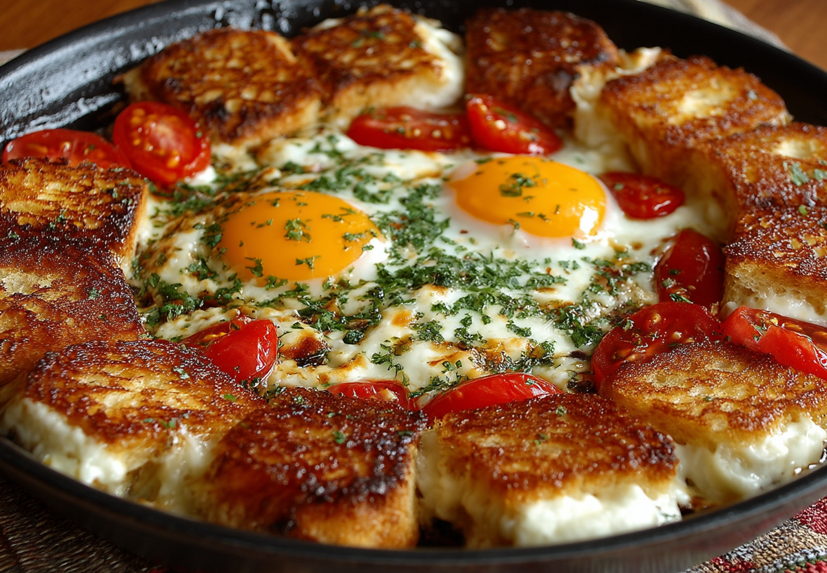 Для приготовления понадобится: 4-5 ломтиков батона, 2–3 яйца, 50 г твердого сыра, 1 небольшой помидор, соль, черный перец, паприка. Разогрейте сковороду на среднем огне и смажьте маслом. Булку нарежьте на крупные кубики и выложите их по краю сковороды, формируя круг. Между ломтиками хлеба и в центр положите нарезанные кубиками или ломтиками сыр. Помидор нарежьте кубиками и выложите в центр сковороды поверх сыра. Аккуратно разбейте яйца в центр, стараясь не повредить желтки. Посолите, поперчите, посыпьте специями. Накройте сковороду крышкой и готовьте на среднем огне 5–7 минут, пока белок яиц не схватится, сыр не расплавится, а хлеб снизу не подрумянится. Подавайте сразу же, прямо в сковороде.