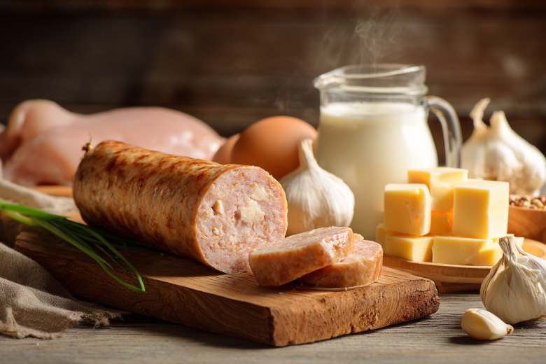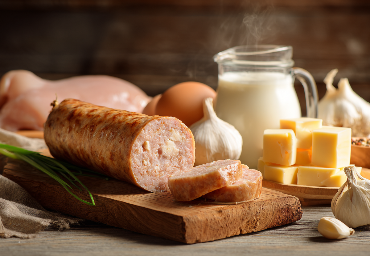 Часть филе нарежьте мелкими кусочками, остальное измельчите до кремовой массы со сливками, белками и специями. Добавьте чеснок и тертый сыр, перемешайте с кусочками мяса. Выложите фарш на пергамент, сформируйте плотный батон и перевяжите. Заверните в пакеты и варите около 30 минут. Остудите, уберите в холодильник, затем нарежьте. Отлично идет на бутерброды и перекус — просто, сытно и по-домашнему.