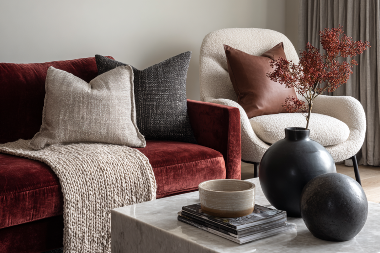 Пример: диван из гладкой ткани (база) + вязаный плед (средний слой) + подушки из бархата и хлопка (акценты). Все просто, но эффект — как после работы стилиста.