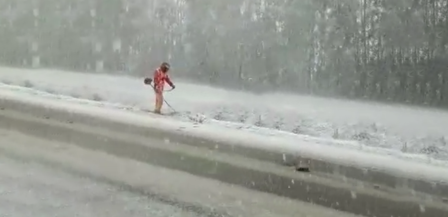 Очевидец снял происходящее на видео и опубликовал в Facebook. На кадрах мужчина в оранжевой спецодежде работает с триммером на обочине трассы.