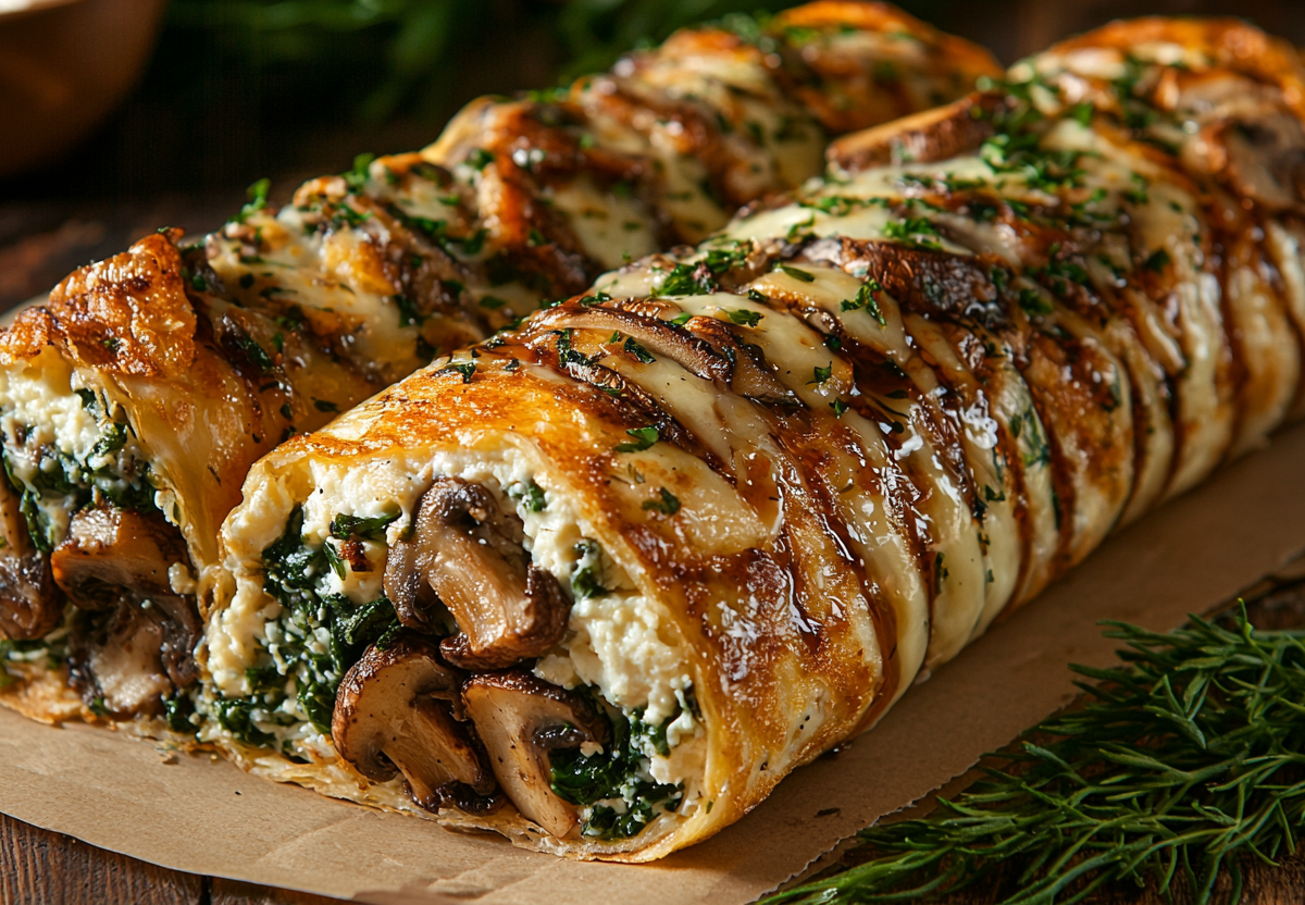 1. Обжарьте начинку. Грибы нарежьте пластинками, лук мелко порубите. На сухой сковороде обжарьте грибы до золотистости. Добавьте шпинат и сливки. Тушите две-три минуты до загустения