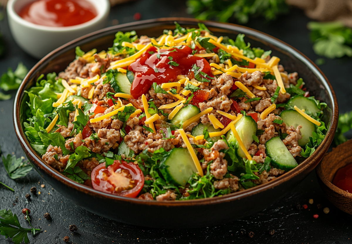 Вам понадобится: 400 г мясного фарша, 1 кочан салата айсберг (или просто зеленого салата), 1 красная луковица, 3 маринованных огурца, 150 г твердого сыра, 2 помидора, 4 ст. л. майонеза и 1 ст. л. кетчупа. Фарш обжарьте с мелко нарезанным луком до румяности, посолите и поперчите. Салат айсберг нарвите руками, огурцы нарежьте соломкой, помидоры кубиками, сыр натрите на терке. Все ингредиенты смешайте в салатнице. Для заправки соедините майонез с кетчупом.