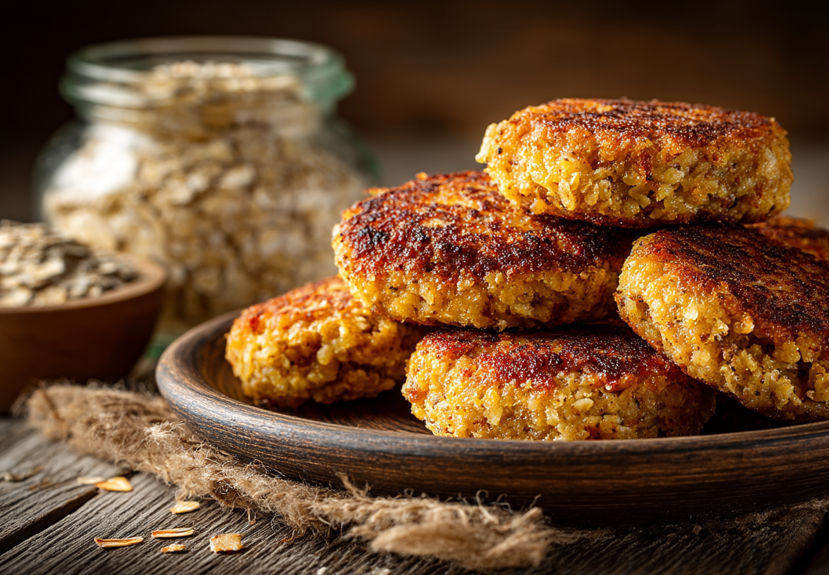 Овсяные хлопья залейте кипятком так, чтобы вода их едва покрыла, накройте и дайте набухнуть и остыть 20 минут — они впитают влагу и станут клейкими. Лук мелко нарежьте и обжарьте на растительном масле до золотистого цвета — это ключ к карамельному вкусу. Чеснок пропустите через пресс. В миске смешайте набухшую овсянку, лук, чеснок, соевый соус, томатную пасту, все специи и муку. Вымесите массу до однородности. Дайте массе постоять 10 минут. Обжаривайте котлеты на среднем огне с двух сторон по 4–5 минут до румяной корочки, затем убавьте огонь, накройте крышкой и доведите до готовности еще 5–7 минут.
