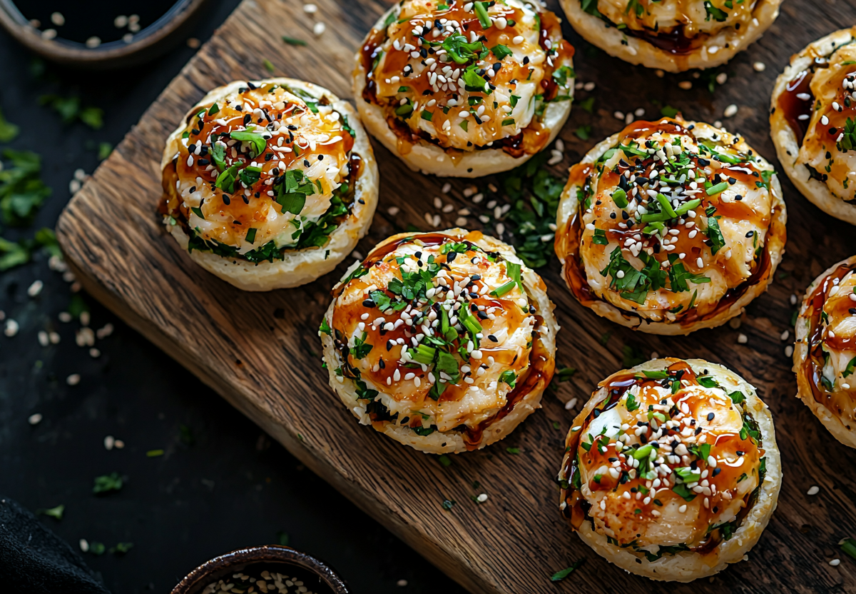 Крабовые палочки (200 г) разбираю на тонкие волокна вилкой. Пармезан (100 г) натираю на мелкой терке. В миске соединяю крабовые палочки, пармезан, творожный сыр (100 г), майонез (3 ст. л.) и соус шрирача (1 ч. л.) для пикантности. Тщательно все перемешиваю до однородной кремообразной массы. Готовые песочные тарталетки (12 шт.) выкладываю на противень, застеленный пергаментом. Чашечкой или ложкой наполняю каждую тарталетку начинкой с небольшой горкой. Отправляю в разогретую до 180 °C духовку на 12–15 минут, пока края тарталеток не подрумянятся, а сырная начинка слегка не пропечется. Вынимаю противень. Сразу же поливаю каждую тарталетку сверху соусом терияки или унаги (примерно 2 ст. л. в сумме) и щедро посыпаю кунжутом (1 ст. л.). Подаю теплыми.