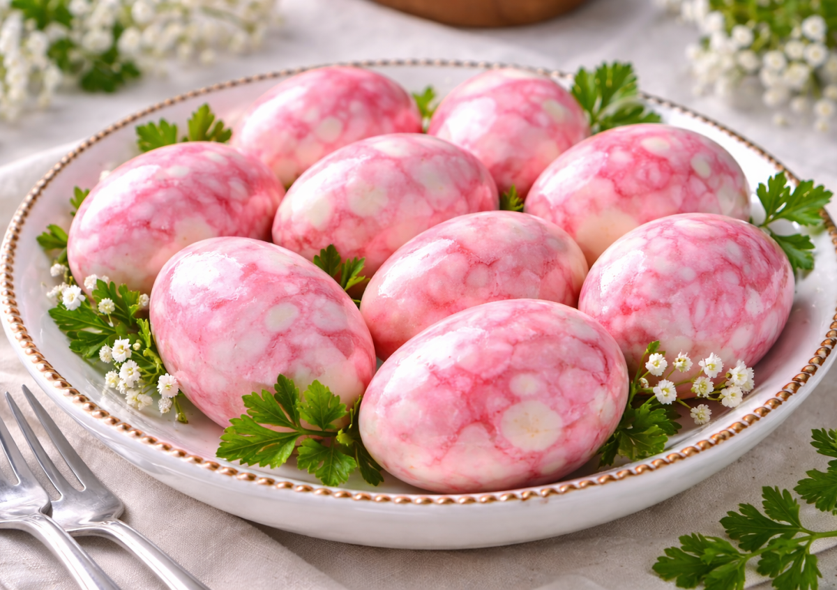 Чтобы цвет получился ярким и красивым, лучше брать яйца с белой скорлупой и обязательно добавлять уксус — он закрепляет оттенок и помогает создать тот самый мраморный эффект.
