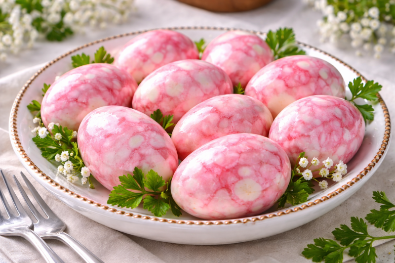 Для холодного способа свеклу натирают на терке, смешивают с уксусом и полностью покрывают этой массой яйца. Оставляют на 30–90 минут — чем дольше, тем насыщеннее цвет. Затем яйца достают, дают обсохнуть и слегка протирают салфеткой с каплей масла.