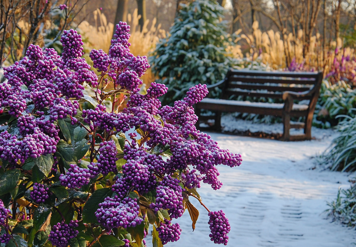 Красивоплодник Бодиньера — фиолетовое чудо в зимнем саду! Этот удивительный кустарник (Callicarpa bodinieri) становится настоящей сенсацией среди ландшафтных дизайнеров. Согласно исследованиям Главного ботанического сада РАН, красивоплодник сорта Profusion демонстрирует уникальную морозостойкость (до -23 °C), что позволяет выращивать его в средней полосе России с зимним укрытием, а на юге без укрытия.