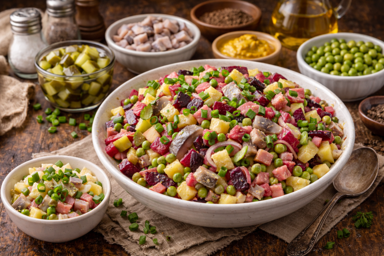 Этот вариант знаменитого салата с селедкой приятно удивляет вкусом и подачей. Без слоев и тяжелого майонеза — салат получается легким, сочным и очень гармоничным. Отличная идея для праздничного стола или необычного семейного ужина.