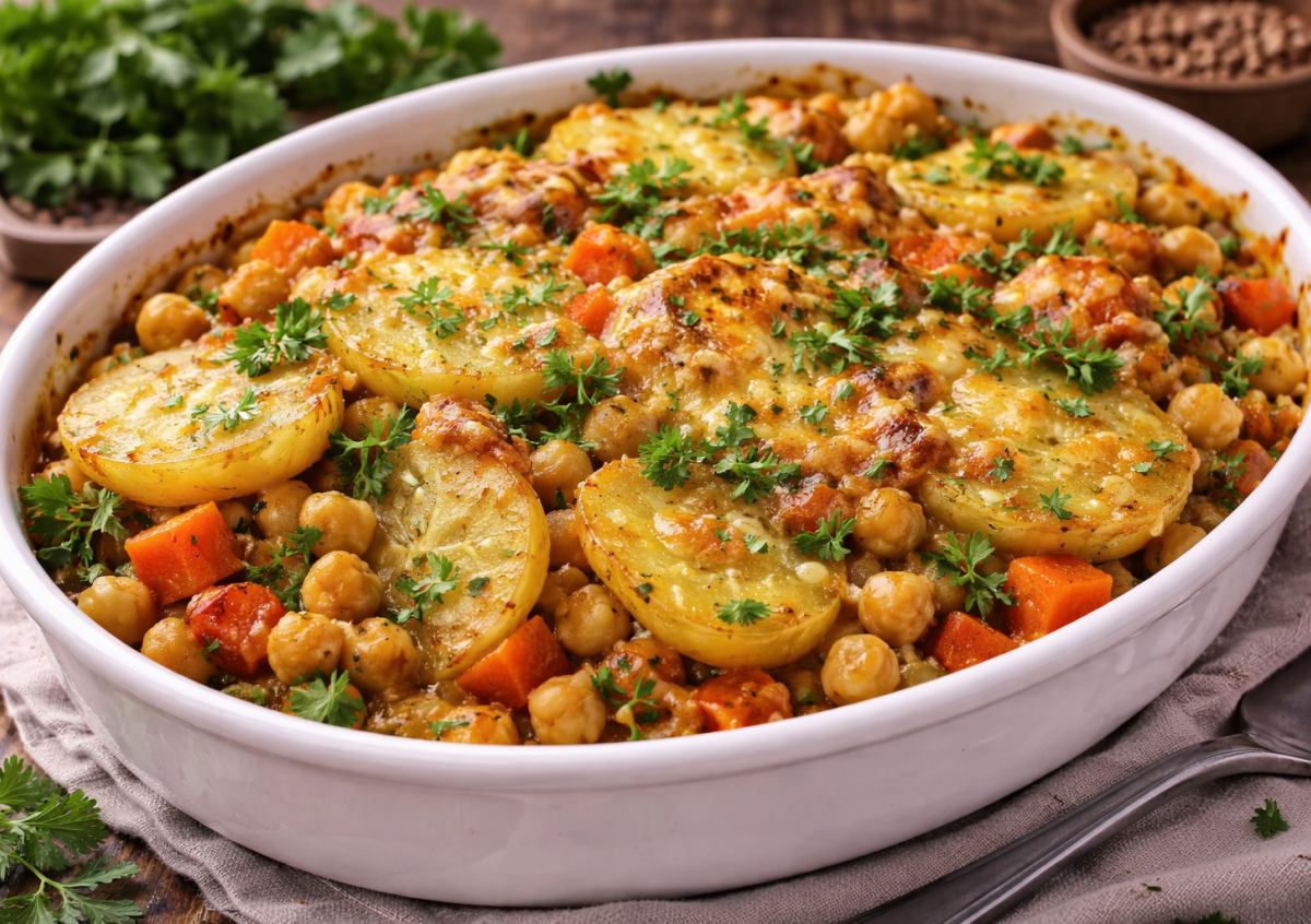 Как-то я неожиданно купила банку консервированного нута, и получилась суперзапеканка. Эта ароматная картофельная запеканка вдохновлена южноиндийской кухней, но готовится максимально просто. Консервированный нут экономит время, а специи превращают привычные овощи в яркое и сытное блюдо. Запеканка хороша и как самостоятельный ужин, и как необычный гарнир.