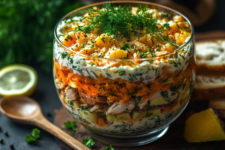 Знаете, какие салаты самые удачные? Те, в которых знакомые продукты встречаются в неожиданном сочетании и рождают совершенно новый вкус. Салат «Афоня» — именно из этой категории. В нем нет ничего экзотического, но благодаря удачному союзу нежной курицы, пикантной корейской морковки и копченого сыра он получается на удивление насыщенным и многогранным. Этот салат не просто кормит — он создает настроение, он сытный, яркий и очень эффектно смотрится в разрезе, когда видны все его аппетитные слои.