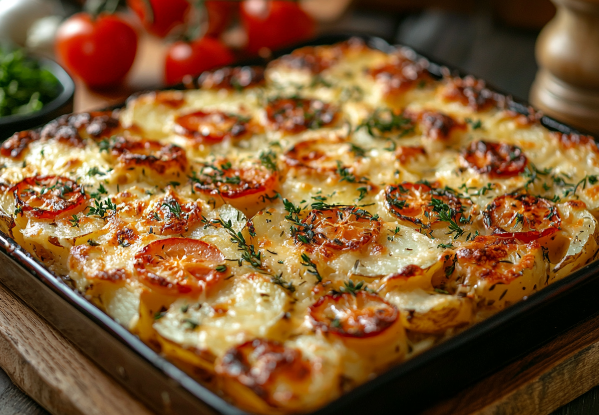 Вам понадобится: 4 картофелины, 2 куриные грудки, 1 крупная луковица, 2 помидора, 150 г твердого сыра, 180 г сметаны, соль и специи по вкусу. Картофель нарежьте тонкими колечками и выложите первым слоем на смазанный маслом противень, посолите. Куриную грудку нарежьте пластинами, лук — полукольцами. Распределите курицу и лук поверх картошки. Равномерно смажьте все сметаной. Сверху уложите кружочки помидоров и обильно посыпьте тертым сыром. Запекайте в разогретой до 180 °C духовке около 35–40 минут до мягкости картофеля и аппетитной золотистой корочки на сыре.