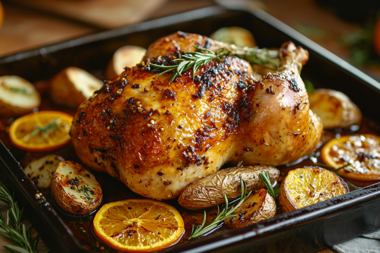 Это блюдо — воплощение мечты: минимум подготовки, один противень, а на выходе — целый праздничный ужин. Сочная курица с хрустящей кожей, ароматный картофель и цитрусовые ноты, которые создают невероятную атмосферу.