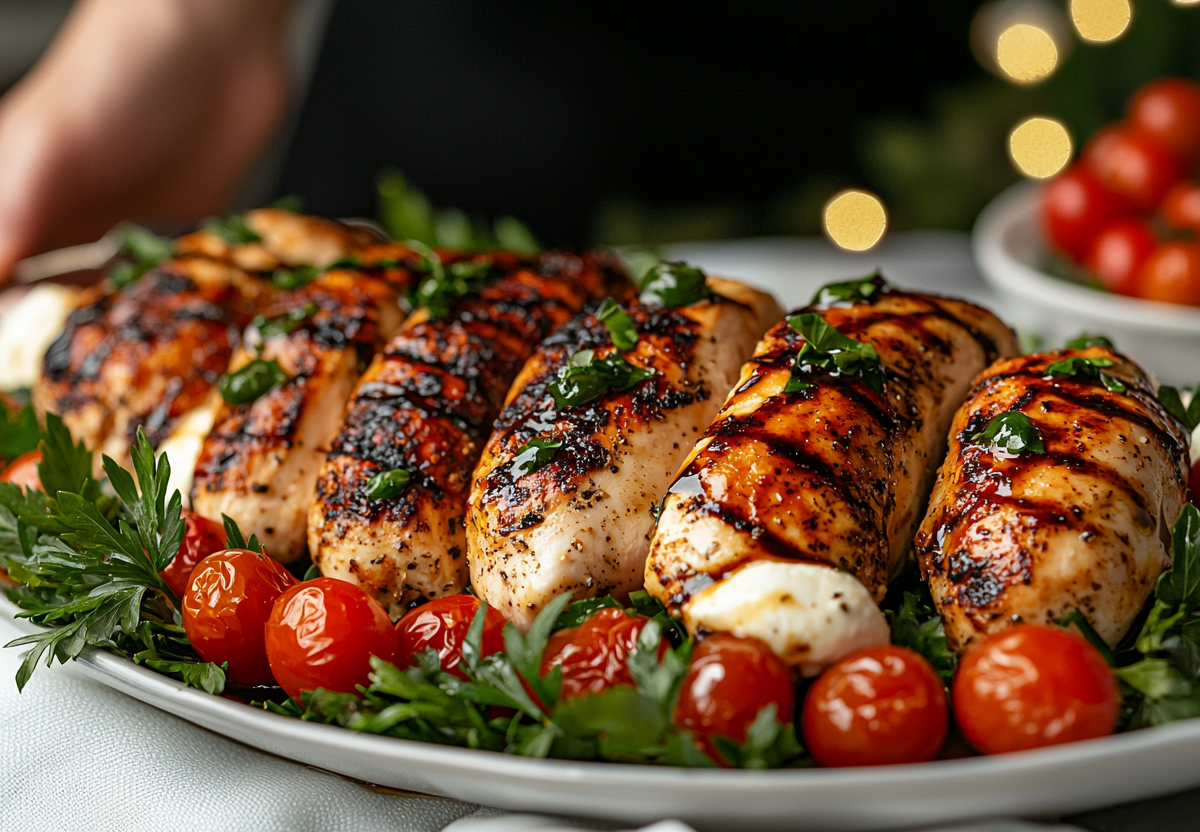 Вкус этого блюда — невероятно насыщенный: нежная курица пропитывается многогранным соусом с нотками базилика, сладостью меда и кислинкой бальзамика, а расплавленная моцарелла и сочные томаты добавляют свежести классического сочетания «Капрезе».