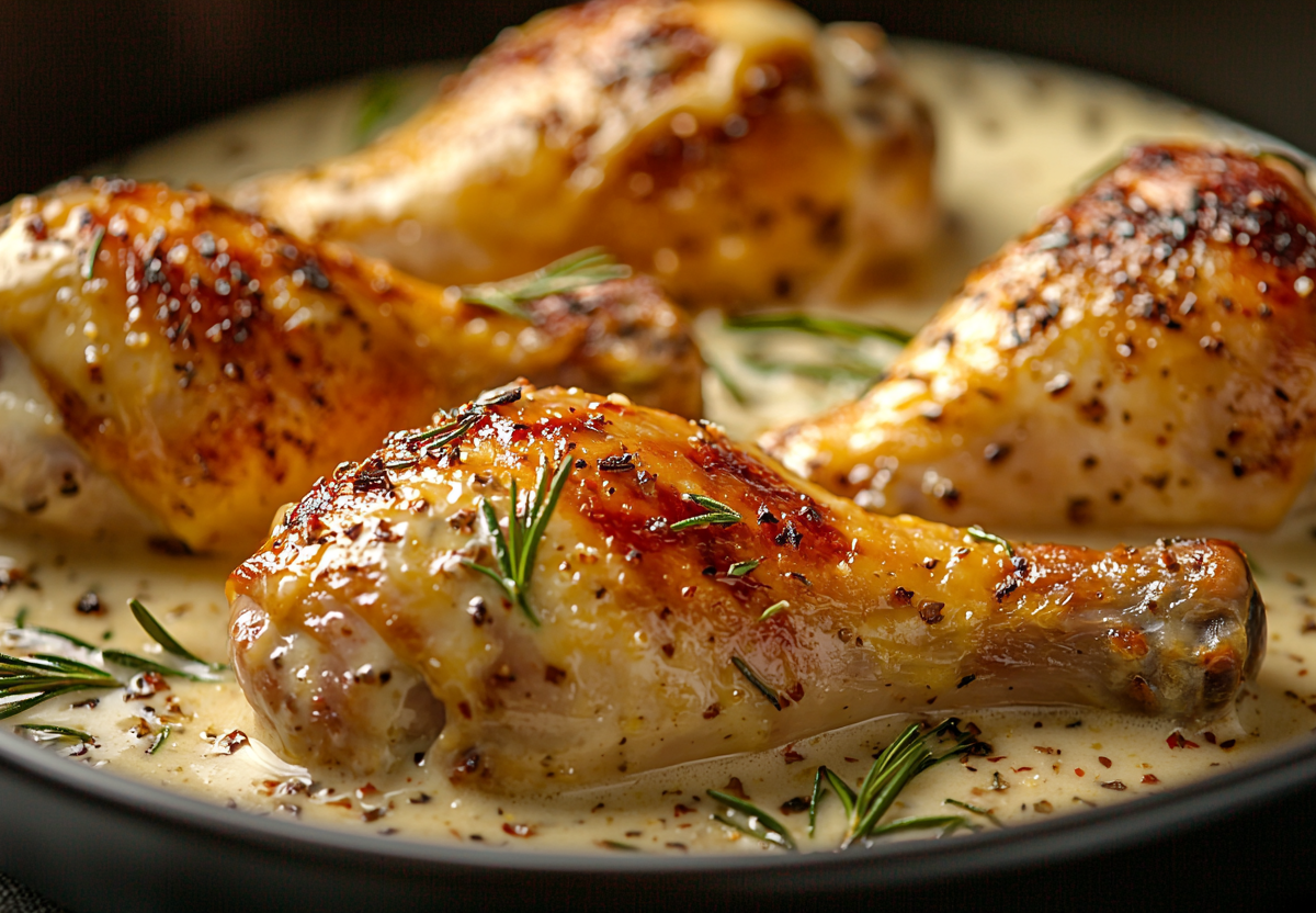 Вкус блюда — это настоящая гармония: курица приобретает глубокий, насыщенный вкус, корочка становится нежной и липкой, а соус на основе сливок, чеснока и специй густеет, превращаясь в бархатистый, пикантный крем с нотками чеснока и трав.