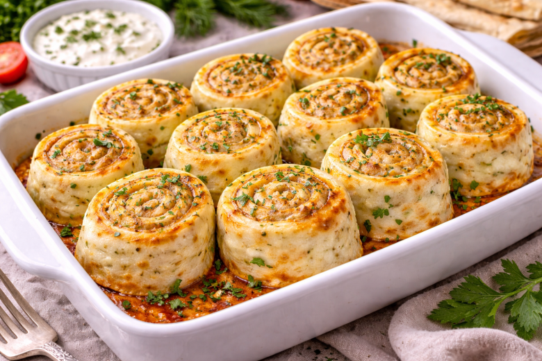 Как готовлю: лаваш раскладываю на столе. Фарш смешиваю с мелко нарезанным луком, яйцами, солью и специями, равномерно распределяю по лавашу, посыпаю тертым сыром. Сворачиваю плотным рулетом, нарезаю кусочками по 3–4 см и выкладываю в форму, слегка смазанную маслом. Запекаю при 180 °C 20–25 минут до румяной корочки. Подаю горячими с йогуртовым соусом с чесноком и зеленью — просто, быстро и очень вкусно.
