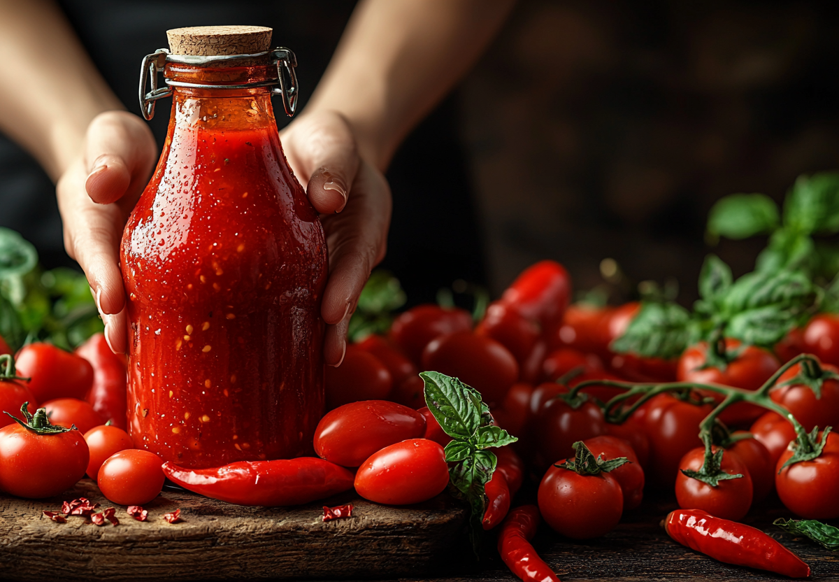 Возьмите литр томатного сока, 1,5 кг сладкого перца, 100 мл уксуса 9%, 150 г сахара, 1,5 столовой ложки соли, пять зубчиков чеснока.