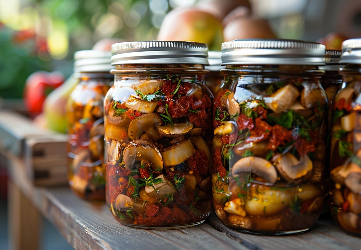 Потребуется: один килограмм острого перца, полкилограмма шампиньонов, семьсот граммов вяленых томатов в масле, одна крупная груша. Грибы нарежьте пластинами и обжарьте до золотистой корочки. Перец нарежьте квадратиками. Вяленые томаты вместе с маслом пюрируйте блендером в густой соус. Грушу нарежьте тонкими дольками. В сотейнике смешайте томатную пасту, грибы, перец и грушу. Тушите без крышки сорок минут, чтобы соус выпарился и загустел. В конце добавьте пятьдесят миллилитров бальзамического уксуса и две щепотки сушеного чеснока. Разложите горячим по банкам и закатайте крышками. Это лечо идеально как теплый гарнир к стейку или полента.