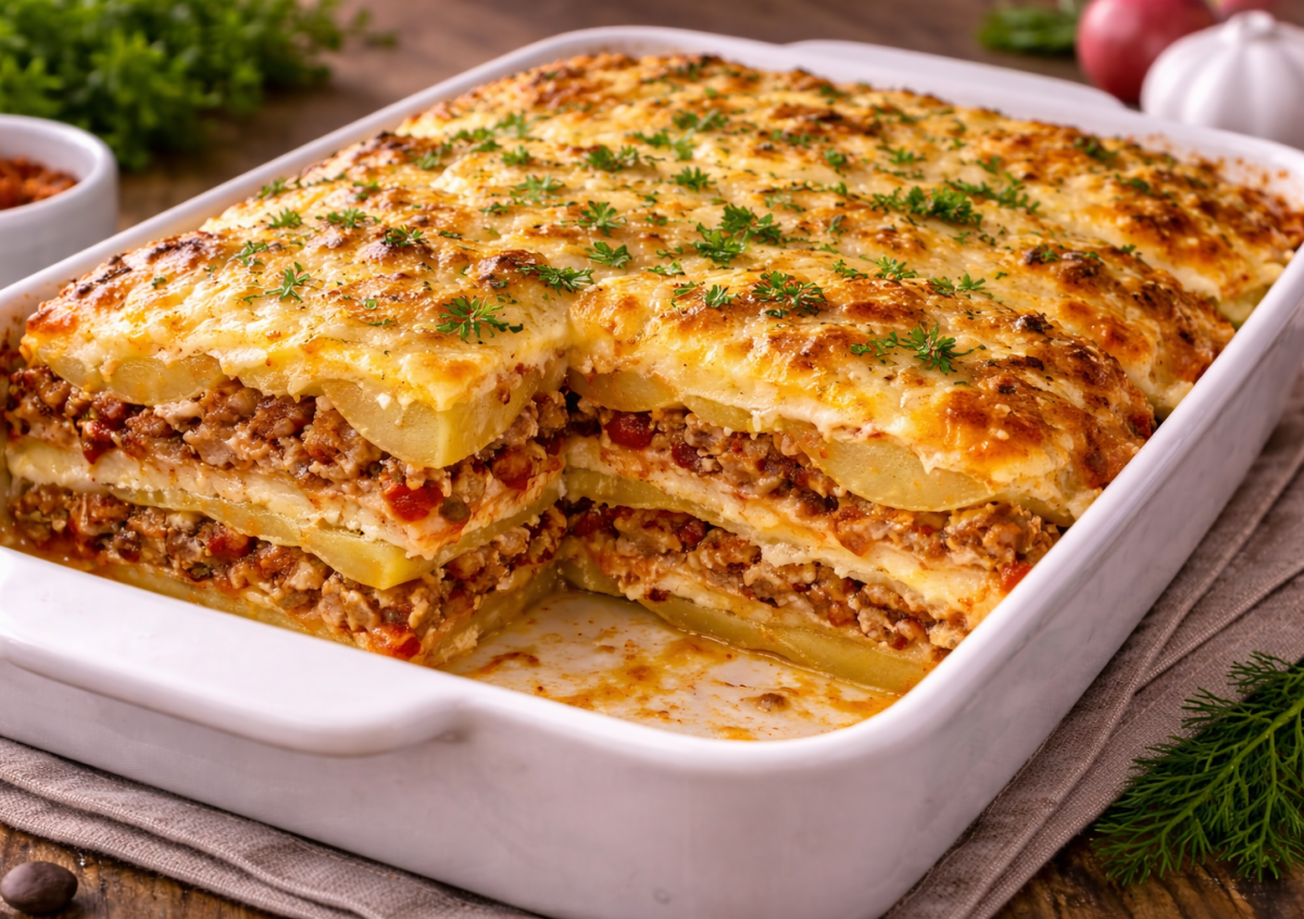Нежные слои картофеля, сочный мясной соус, сливки и тянущийся сыр — эта лазанья покоряет с первого кусочка. Сверху румяная корочка, внутри — идеальные слои, аромат чеснока и томатов, как в хорошем итальянском ресторане. Готовится просто, из доступных продуктов, а выглядит как блюдо из кафе. При этом себестоимость порции — минимальная, а удовольствие — максимальное.