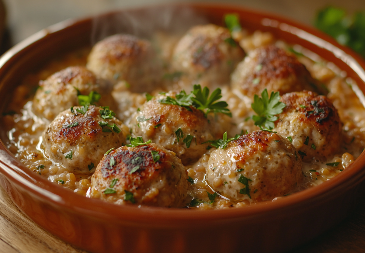 Ленивые тефтели с гречкой — вкусное и полезное блюдо всего за 25 минут! Нежные куриные тефтели с гречневой крупой в ароматном томатно-сметанном соусе. Идеальный ужин для всей семьи: сытно, низкокалорийно (всего 220 ккал/порция) и очень просто готовится. Подавайте с зеленью или свежими овощами.