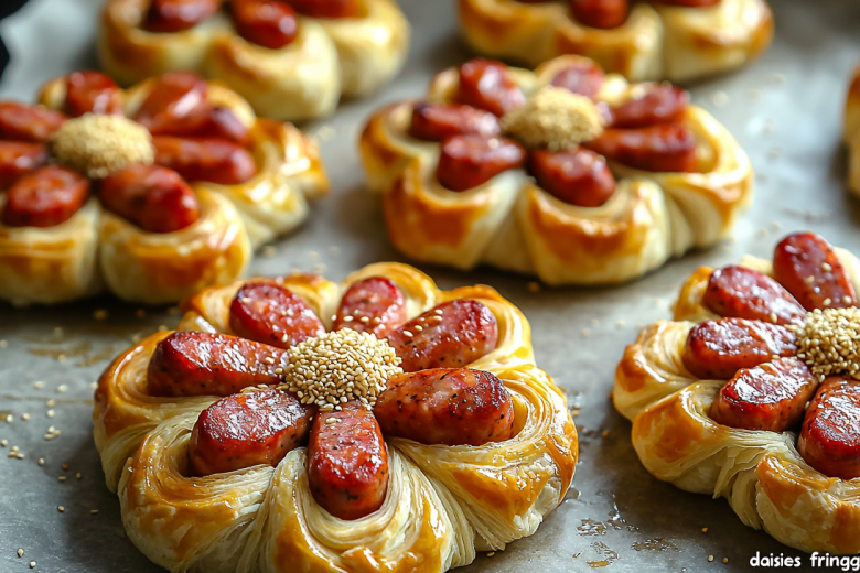 Вам понадобится: 6 сосисок, 500 г слоеного теста, 1 яйцо для смазки, кунжут или мак для посыпки. Разморозьте тесто и раскатайте в пласт толщиной 3–4 мм. Нарежьте на полоски шириной 2–3 см. Каждую сосиску надрежьте вдоль на 6–8 частей, не дорезая до конца, — получится «бахрома». Оберните каждую сосиску полоской теста, оставив «лепестки» свободными. Выложите на противень с пергаментом, смажьте взбитым яйцом и посыпьте кунжутом. Выпекайте 15–20 минут при 200 °C до золотистого цвета. Подавайте с горчицей, кетчупом или разными соусами — эти «ромашки» хороши и в горячем, и в холодном виде.