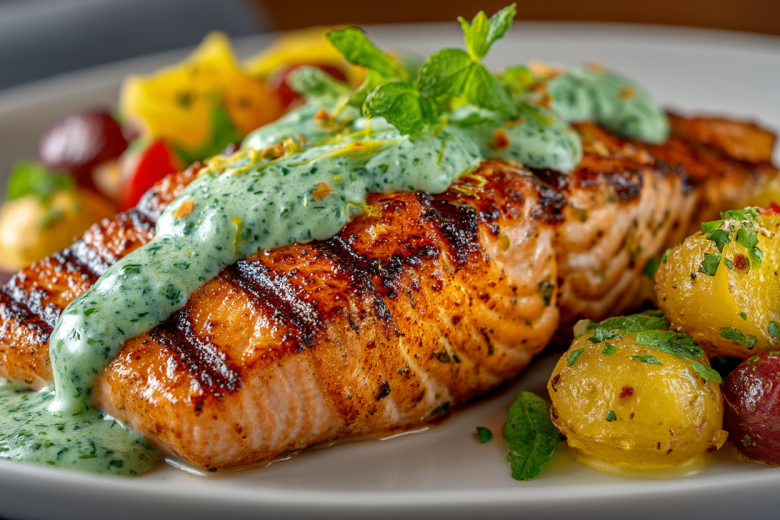 Для подачи выкладываю на тарелку картофельный салат, рядом — горячий стейк лосося. Сверху или рядом поливаю охлажденным мятным соусом и украшаю веточкой укропа.