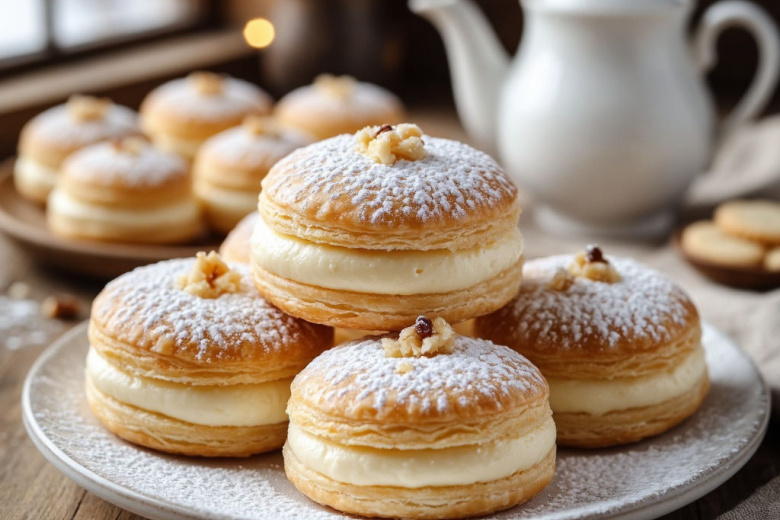 Эта выпечка создает на столе ощущение настоящего зимнего праздника и домашнего уюта. Нежные, воздушные сугробы с хрустящей слоеной основой и тающей во рту творожной начинкой станут центром внимания во время дружеских посиделок. Их готовят из самых простых ингредиентов, а результат радует и глаз, и вкус, создавая теплую, почти волшебную атмосферу.