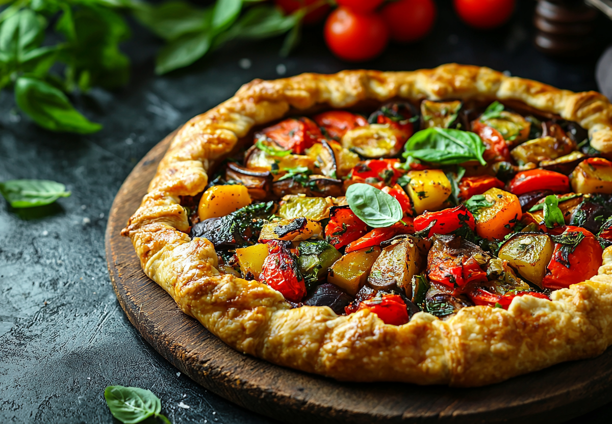 Готовлю я так: сначала делаю соус — томлю лук с чесноком в оливковом масле, добавляю сладкий перец, потом очищенные помидоры и травы, тушу 10 минут. Для теста смешиваю 200 граммов муки с 80 мл растительного масла, 80 мл воды и солью, раскатываю в круг. Тонко нарезаю цукини, баклажаны и помидоры, баклажаны предварительно запекаю. На тесто выкладываю остывший соус, сверху спиралью раскладываю овощи, посыпаю оливками, чесноком и травами. Заворачиваю края теста и выпекаю при 180 °C 35–45 минут до золотистого цвета. Подаю теплым — хрустящее тесто и нежные овощи создают потрясающий контраст.