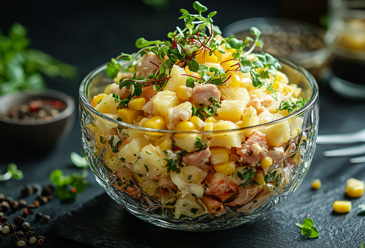 Он идеально подходит как для праздничного стола, так и для уютного ужина в кругу семьи. Нежные кусочки курицы, сочные ананасы и сладкая кукуруза создают гармоничное сочетание вкусов, а готовится блюдо всего за 10 минут!