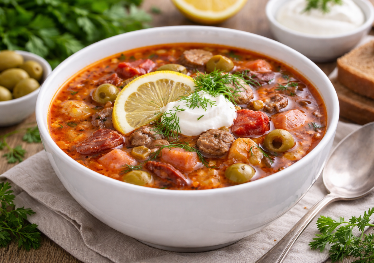 Эта солянка — настоящая находка для холодных дней и семейных обедов. Насыщенный говяжий бульон, копчености, лесные грибы, соленые огурчики и оливки создают глубокий, богатый вкус, от которого невозможно оторваться. Готовлю ее, когда хочется по-настоящему сытного и домашнего — такая солянка всегда собирает всех за столом.