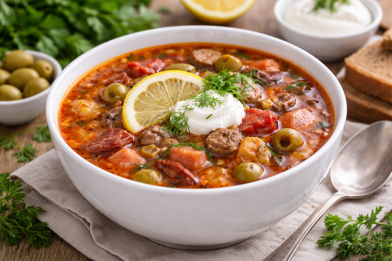 Ингредиенты (на 3–3,5 л): говядина — 300 г, копченая колбаса — 200 г, ветчина — 200 г, репчатый лук — 1 шт., грибы — 200 г, соленые огурцы — 2 шт., оливки без косточек — 150 г, помидоры — 2 шт., томатная паста — 2 ст. л., растительное масло — для жарки, лимон — 1 шт., соль и специи — по вкусу, зелень и сметана — для подачи.