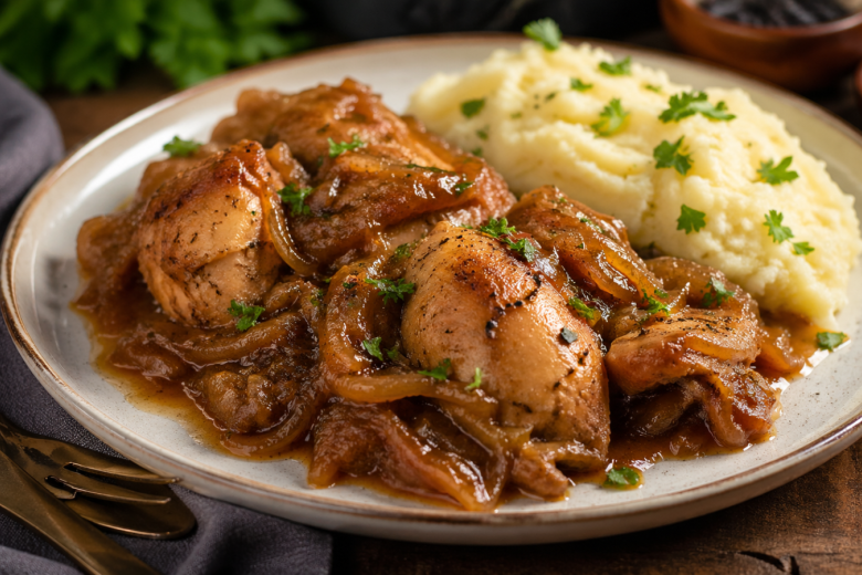 Когда обычная курица уже надоела, этот способ полностью меняет вкус. Всё дело в луке: он превращается в густую, ароматную подливу, которая делает мясо невероятно мягким и сочным. А добавление соевого соуса усиливает вкус и даёт красивый насыщенный цвет.