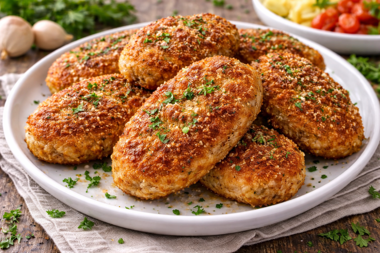 Ингредиенты: фарш (курица и говядина) 500 г, луковица 1 крупная, чеснок 2–3 зубчика, кефир 120 мл, яйцо 1 шт., паприка копченая 1/2 ч. л., соль по вкусу, черный перец по вкусу, панировочные сухари 4–5 ст. л., пармезан тертый 2–3 ст. л., растительное масло для жарки.