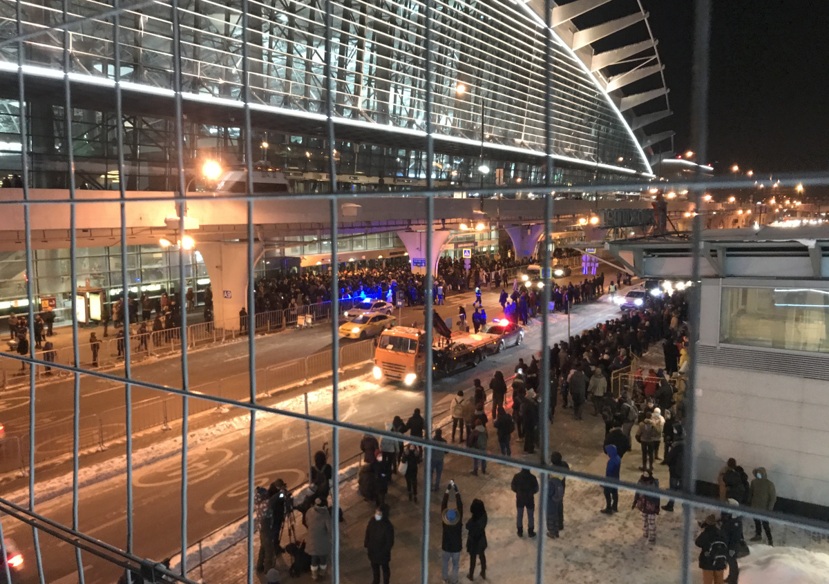 Люди, собравшиеся у входа в терминал московского аэропорта Внуково, протестуют против задержания сторонников оппозиционера Алексея Навального.