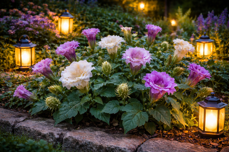 Когда солнце заходит, этот цветок начинает свое настоящее представление. Дурман махровый превращает сад в атмосферное пространство с ароматом, который особенно ярко раскрывается в теплые ночи. Компактные кусты высотой 40–50 см быстро наращивают зеленую массу и обильно ветвятся.