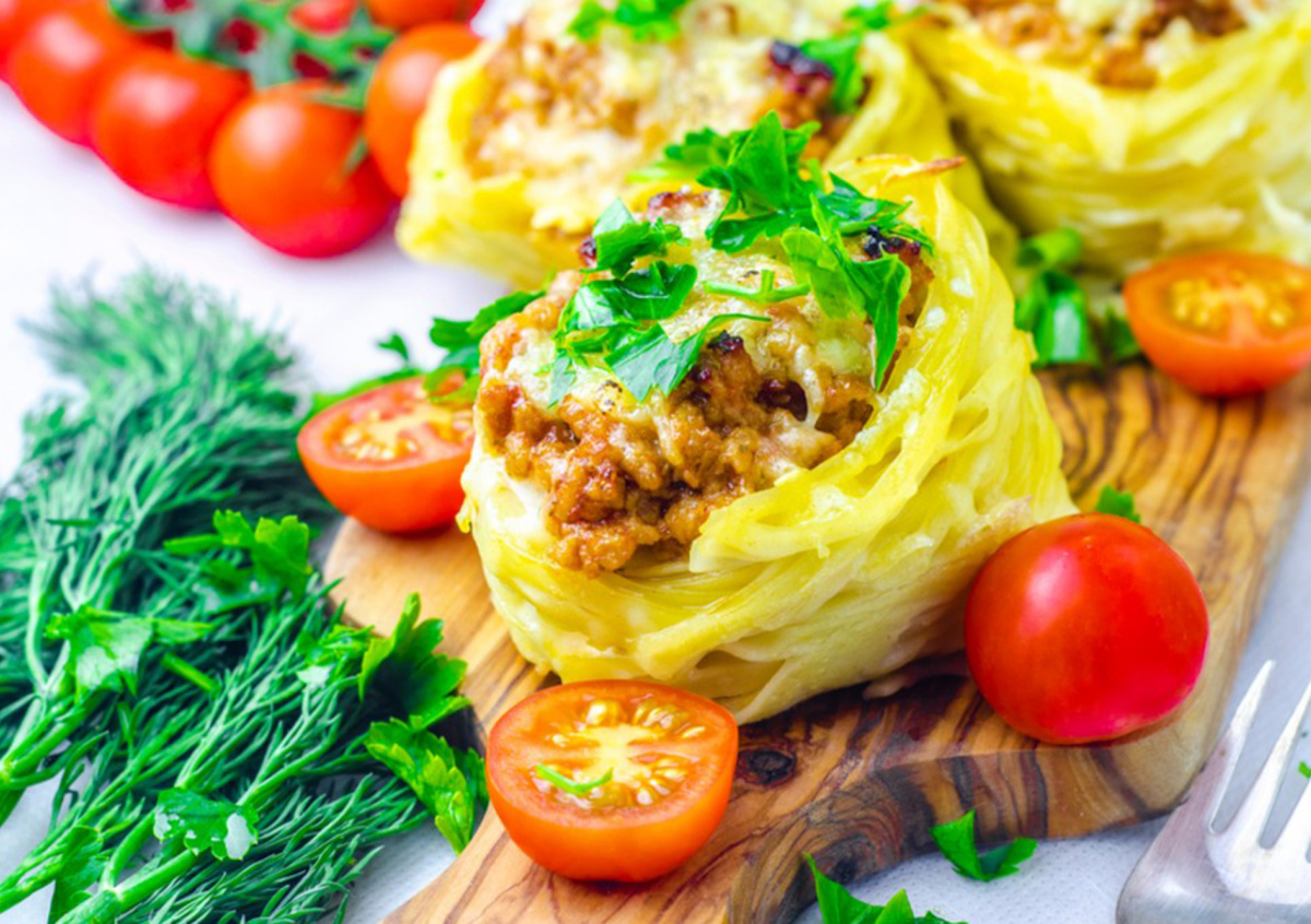 Макаронные гнезда с фаршем в духовке — отличный вариант горячего блюда для новогоднего стола. Тем более что на их приготовление не потребуется много времени.