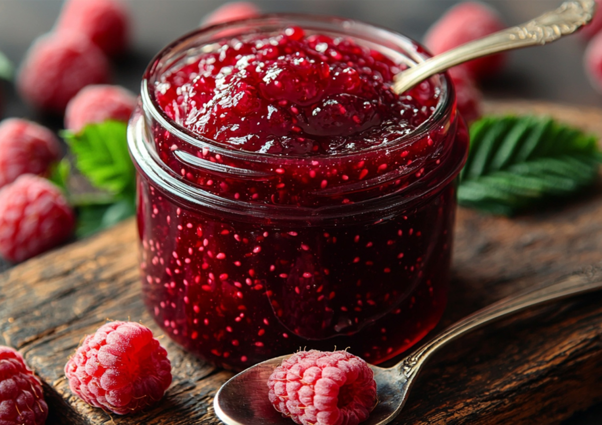 Протертую малину (1 кг) доведите до кипения, добавьте 800 г сахара и сок половины лимона. Варите на медленном огне, постоянно помешивая, пока масса не загустеет. Горячий джем разложите в банки и закатайте. Отлично подходит для тостов и пирогов.