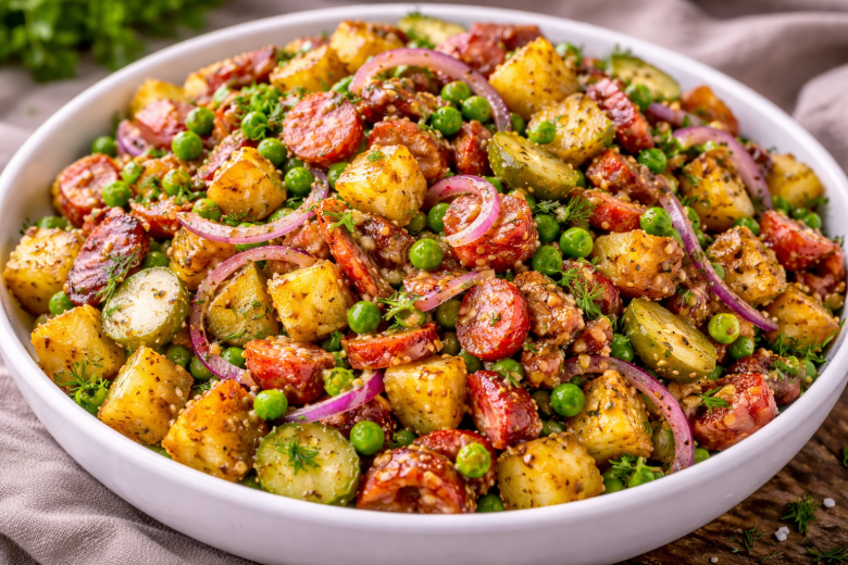 Ингредиенты: картофель — 3-4 шт., маринованные огурцы или корнишоны — 3-4 шт., зеленый горошек — 120 г, копченая колбаса или салями — 120–150 г, бекон (по желанию) — 80 г, лук — 1 шт., чеснок — 1 зубчик, зернистая горчица — 1 ст. л., растительное масло ароматное — 2-3 ст. л., петрушка и укроп — небольшой пучок, соль, черный перец — по вкусу.